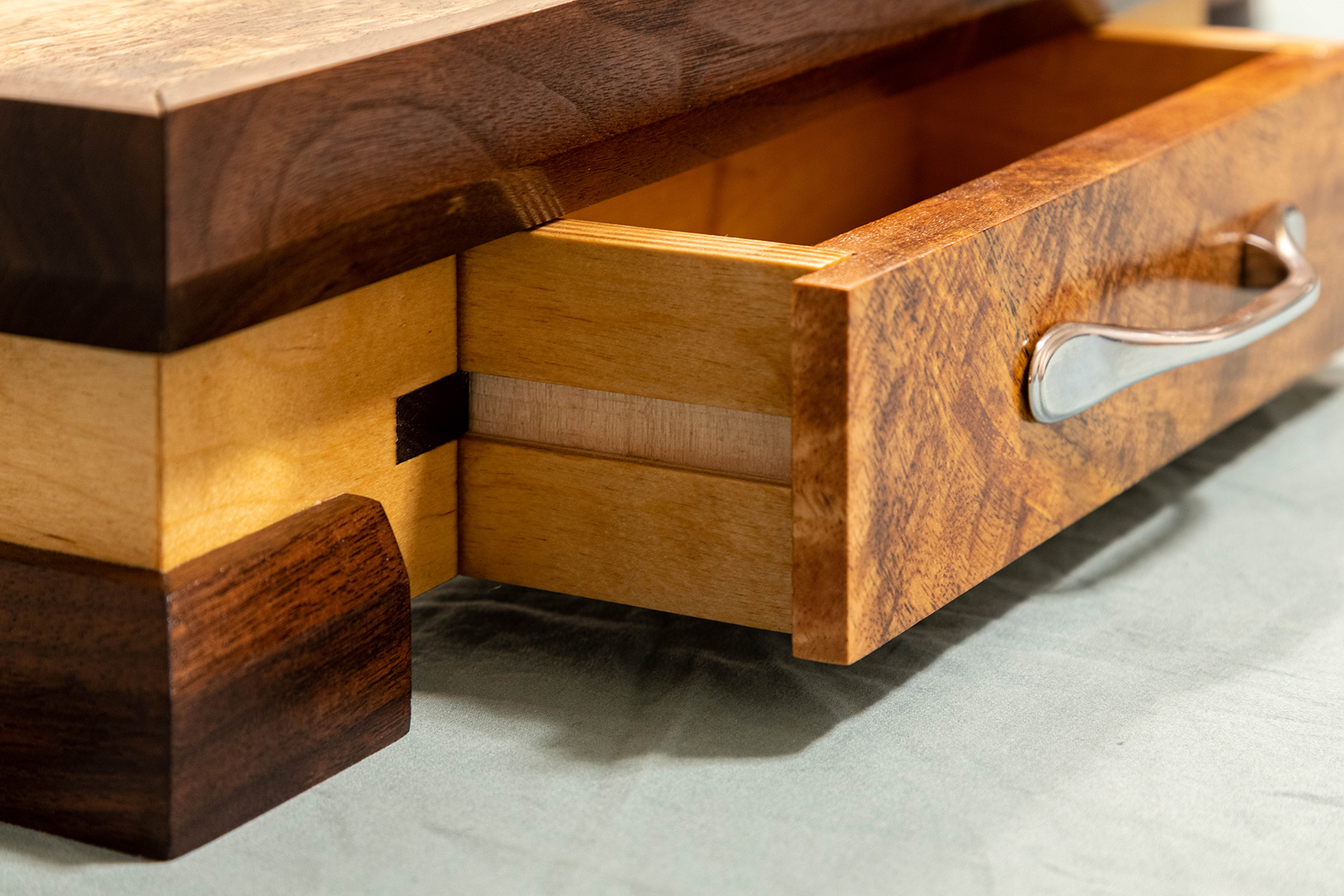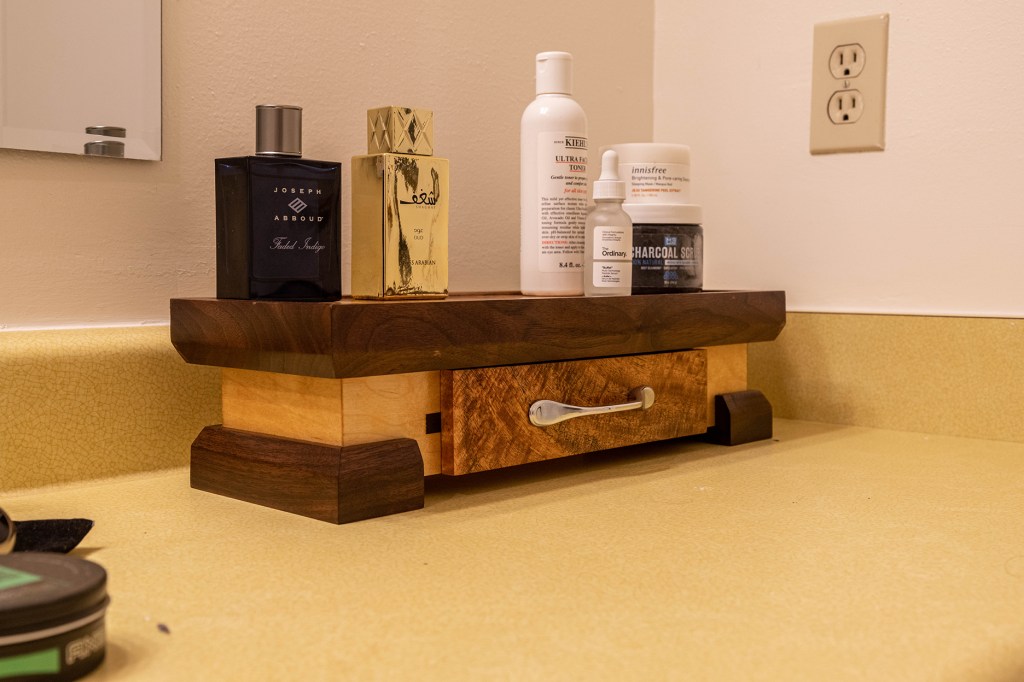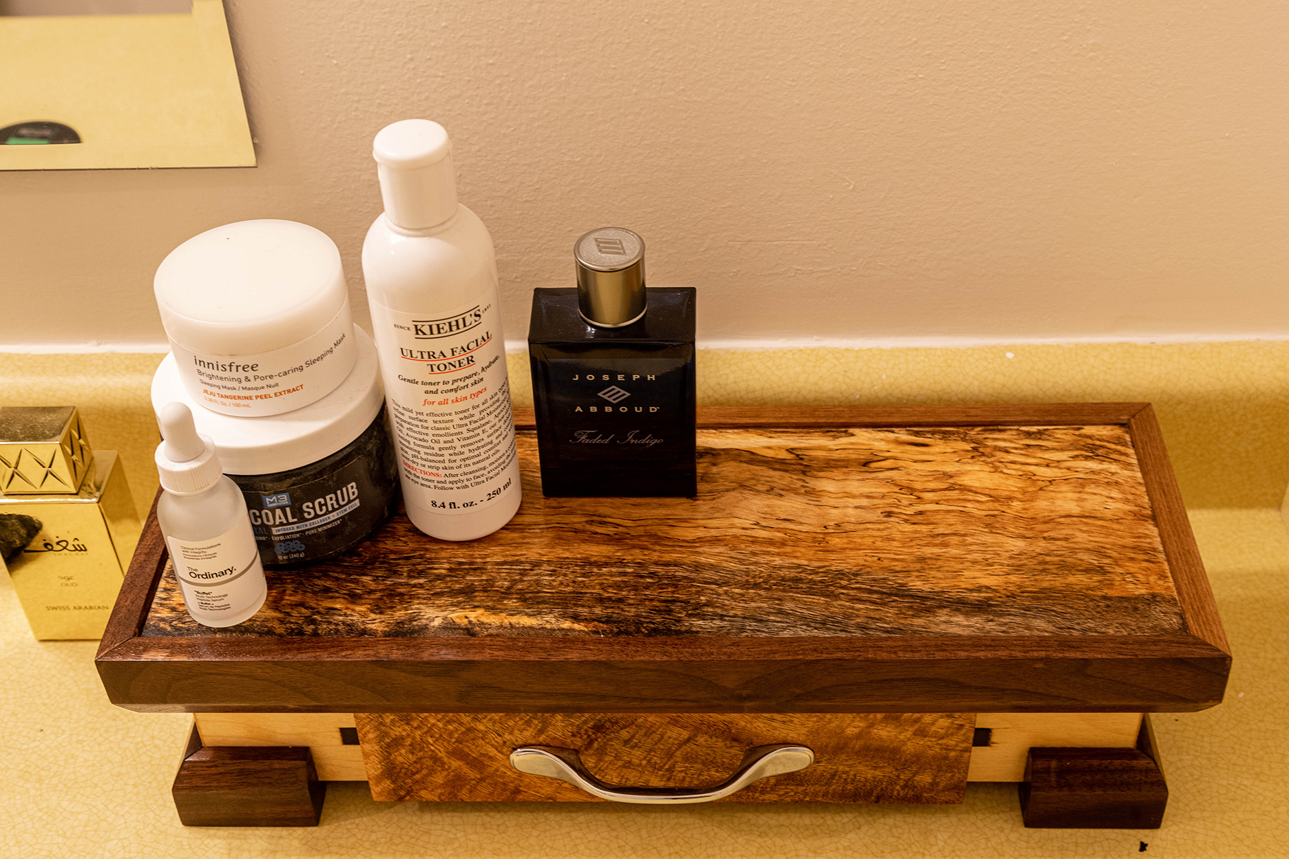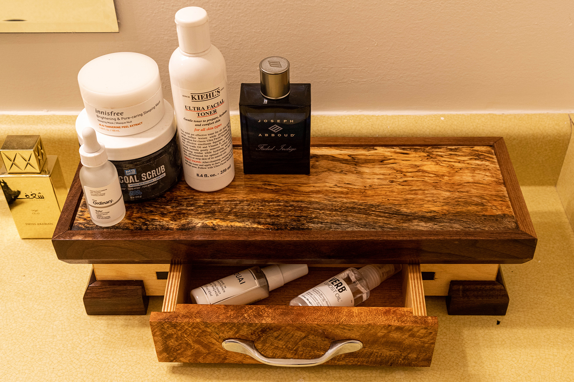 As compact as it is, this project offers plenty of storage for my own products — I planned on making it slightly larger but since everything except the top slab of Mango was from the scrap bin, I tweaked the dimensions to minimize waste with the material I had to work with. The pull is also old stock/reused that I found sitting around our materials pile. Final dimensions are 17″ x 6″ x 4″. This was my first experience making a drawer with wooden slides in a groove — I understand the joint construction is not ideal for strength, but for beauty products I feel it is more than adequate for the job. The drawer joints are inspired by a drawer box I reproduced previously which was for an antique benchtop tool organizer. They used metal fasteners to secure the sides to the face and back, whereas I just went with glue.