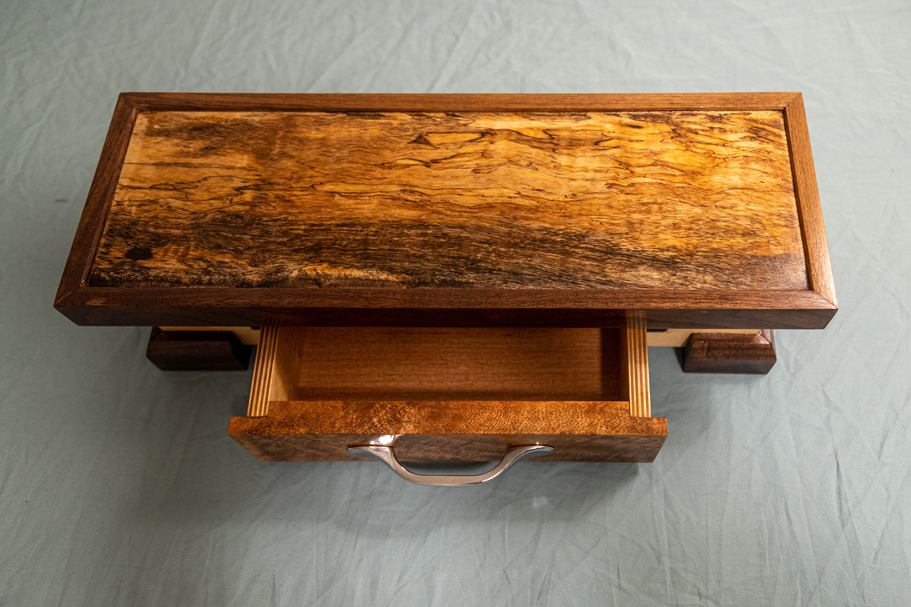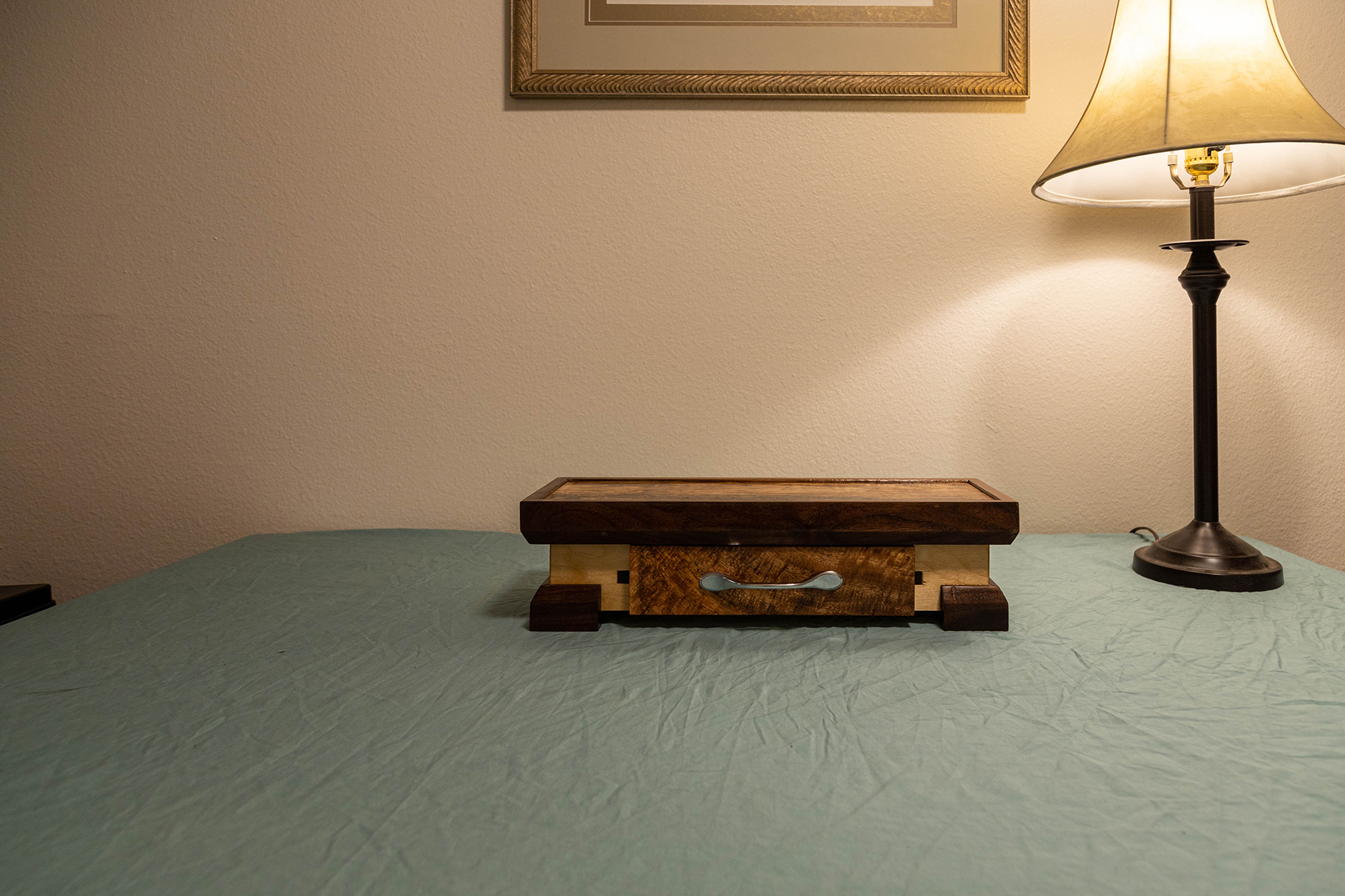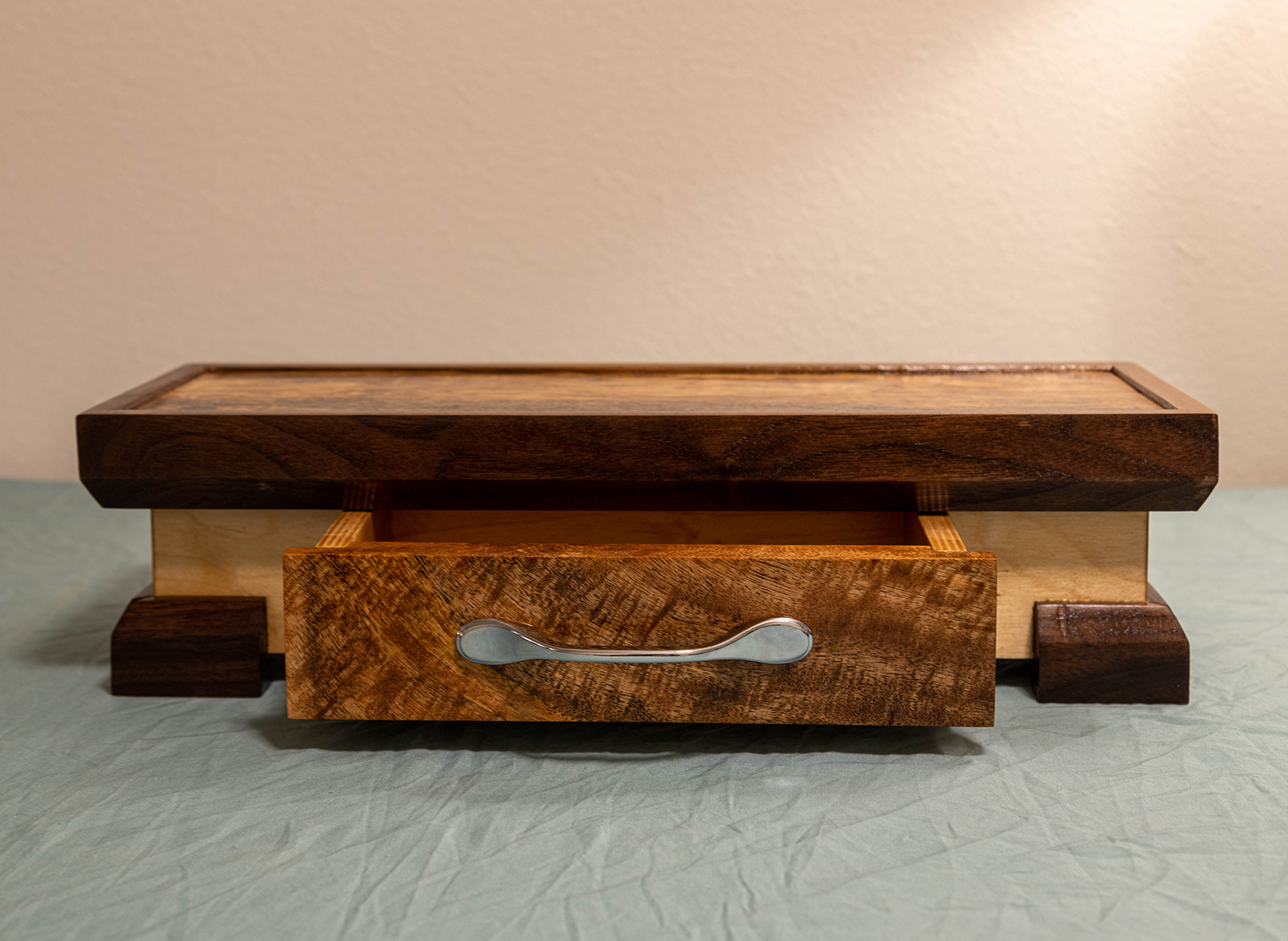 As compact as it is, this project offers plenty of storage for my own products — I planned on making it slightly larger but since everything except the top slab of Mango was from the scrap bin, I tweaked the dimensions to minimize waste with the material I had to work with. The pull is also old stock/reused that I found sitting around our materials pile. Final dimensions are 17″ x 6″ x 4″. This was my first experience making a drawer with wooden slides in a groove — I understand the joint construction is not ideal for strength, but for beauty products I feel it is more than adequate for the job. The drawer joints are inspired by a drawer box I reproduced previously which was for an antique benchtop tool organizer. They used metal fasteners to secure the sides to the face and back, whereas I just went with glue.