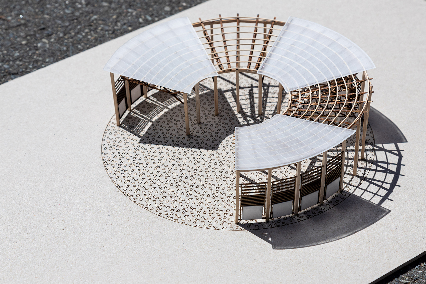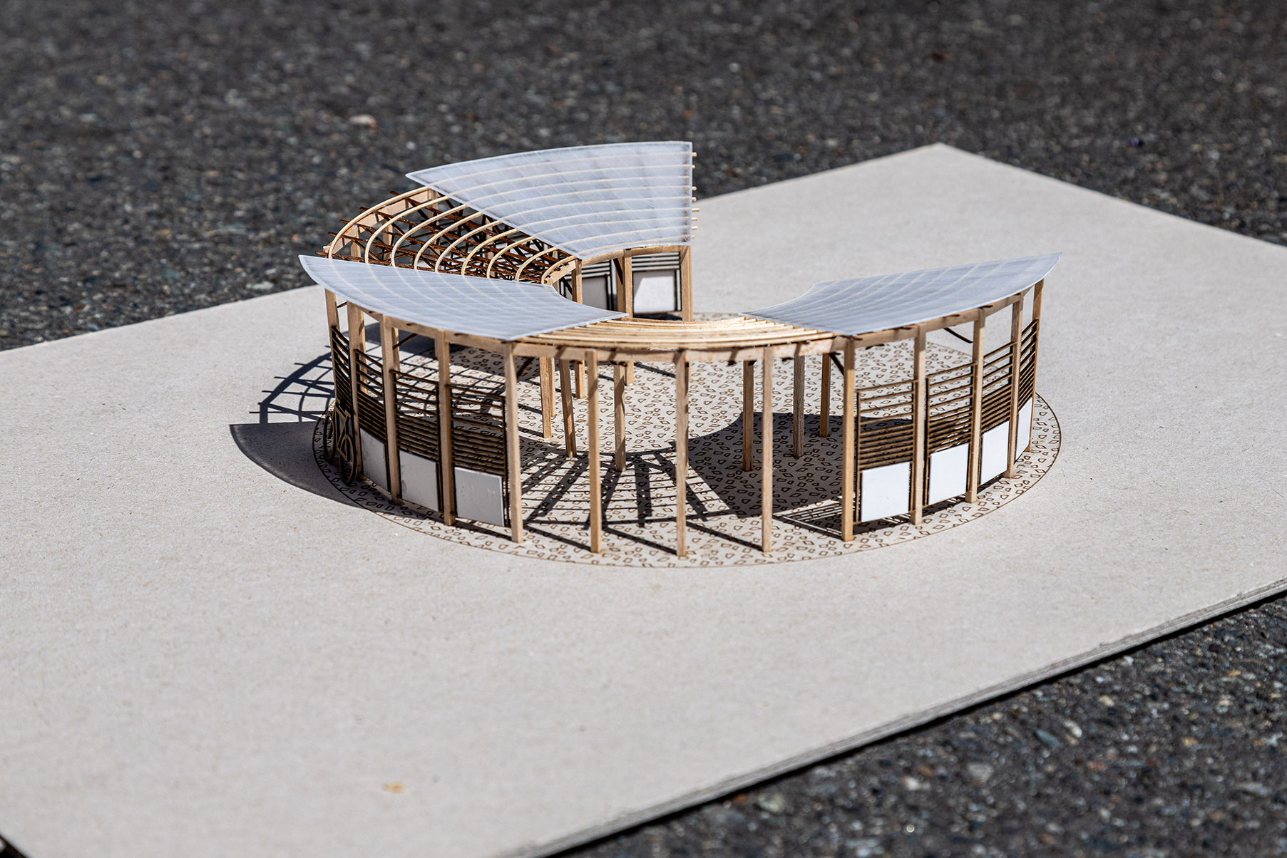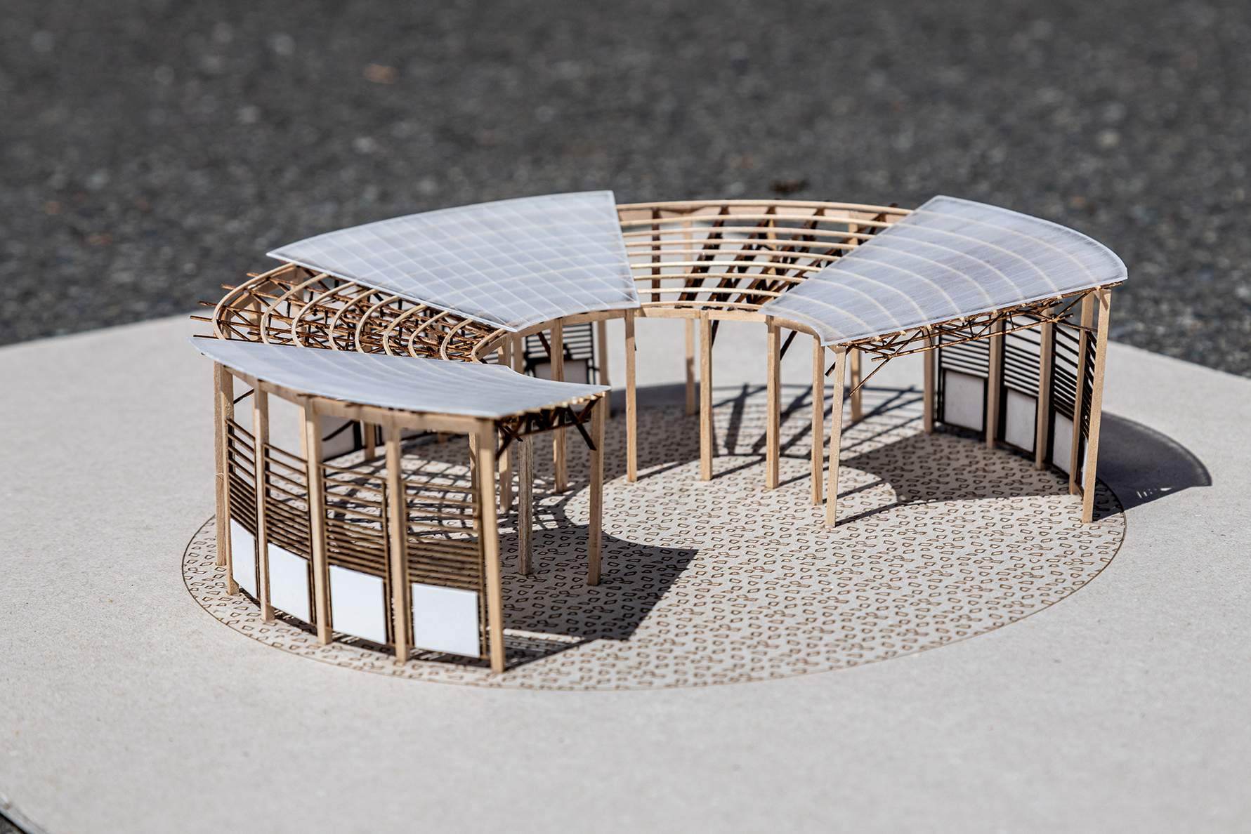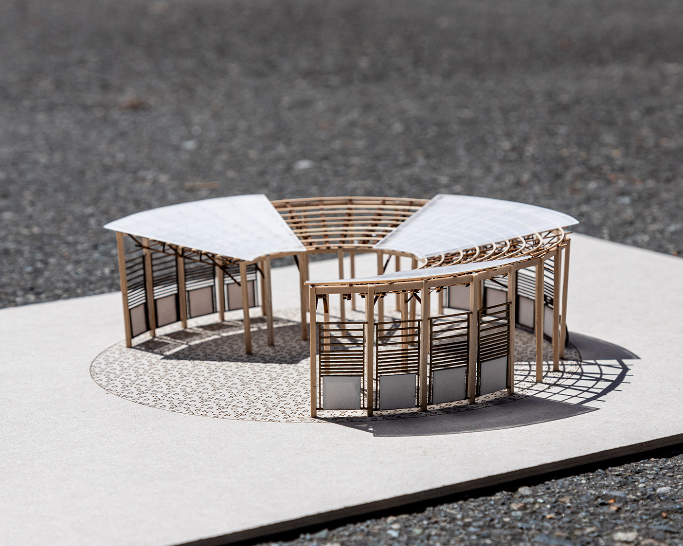 The project brief was to create outdoor shelter with emphasis on open, covered space to be used for gathering and food prep by different stakeholders – UW students, local tribal elders, catering companies, etc. Our site was a large, open field where a row of large trees once stood. The “blank slate” site was actually a formidable challenge, and we didn’t pin down the final location of the structure until the last few weeks of the quarter. Ultimately, we devised a circular structure divided into seven segments with two conjoined sections removed. Three sections were roofed with smoked polycarbonate while two were truss trellises. The open section faces the parking lot entry and the expanse of the field, allowing gatherings to spill out into the open space while still feeling anchored by the pavilion.