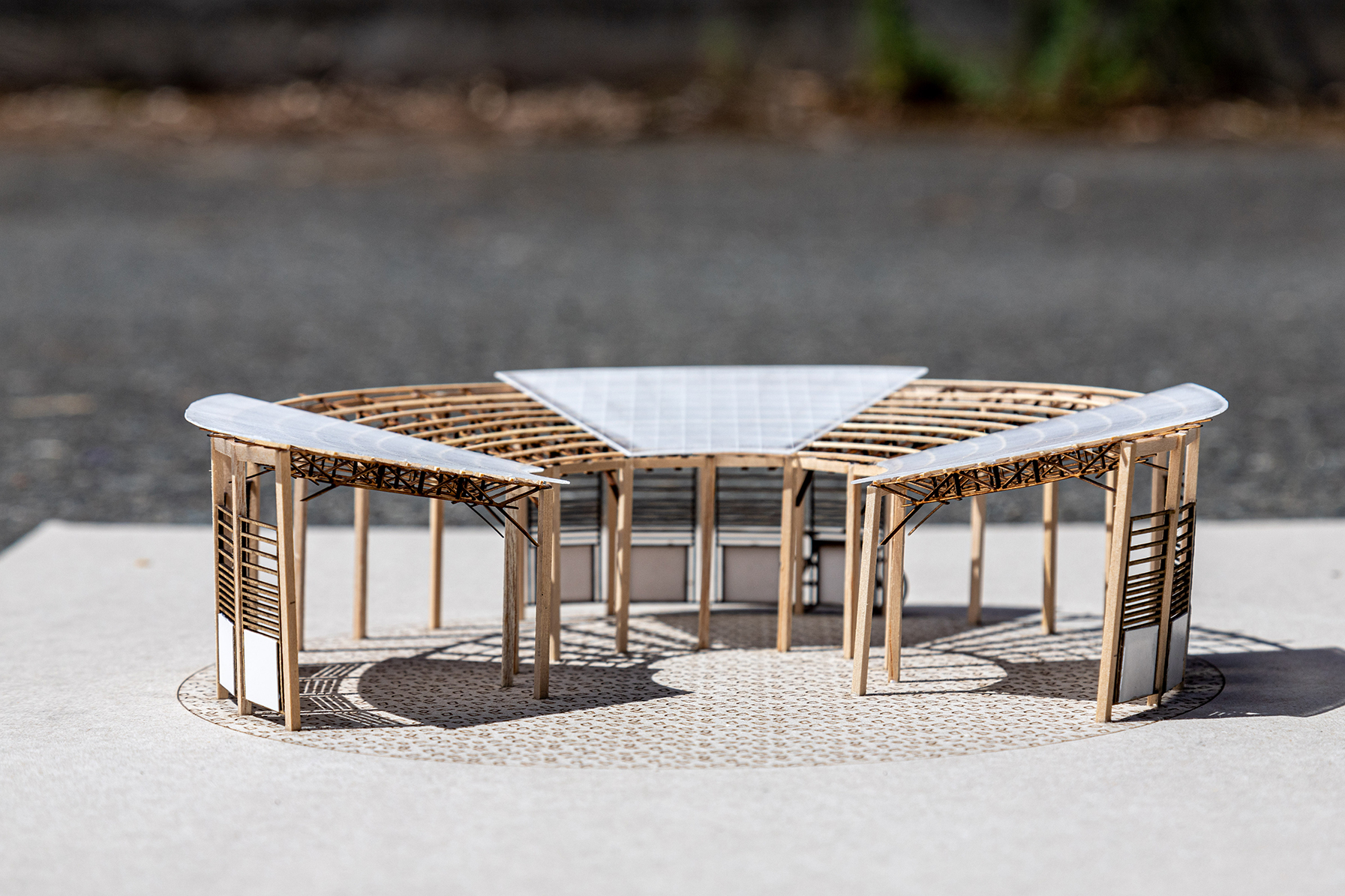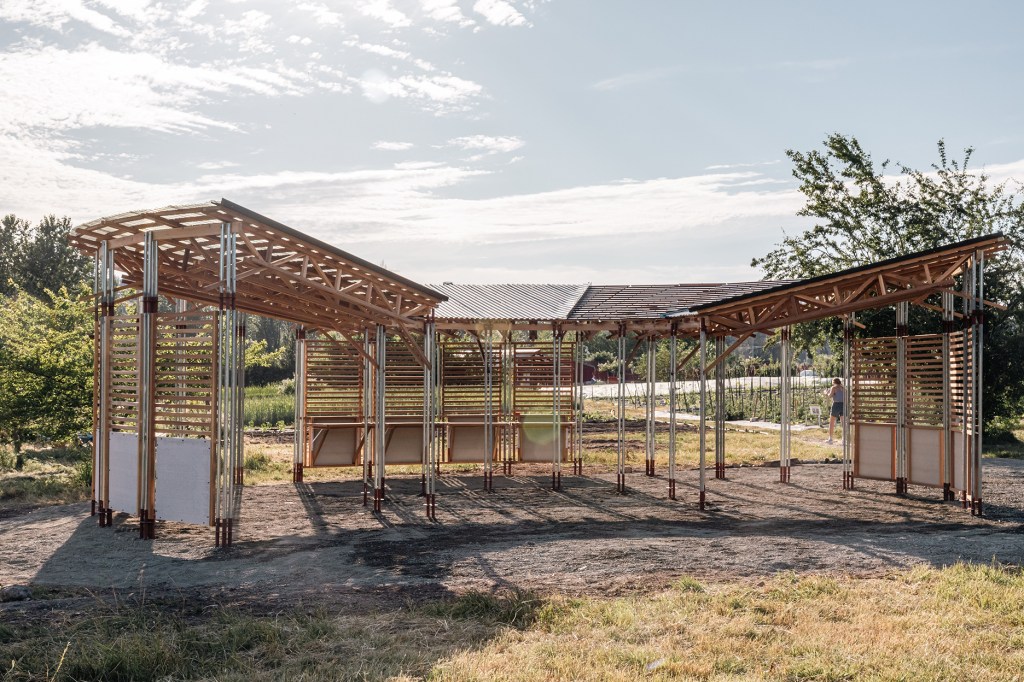 Custom dual- and quad-columns of galvanized steel fence posts with laser cut connector plates were fabricated by students. These columns provide enhanced durability vs. wood columns, create a contrast between the upper, wooden roof structure and the steel vertical system, and also help to ensure the structure is vandal proof (or at least highly-resistant). A number of prefabricated wooden 2×2 trusses rest on two rings of girders spanning between the columns. The trusses support the roof but also contain extended web members that branch out and connect lower into the column, creating triangulation for lateral structural bracing. The wall panels incorporated into the three roofed sections also resist lateral forces, keeping the structure very rigid.