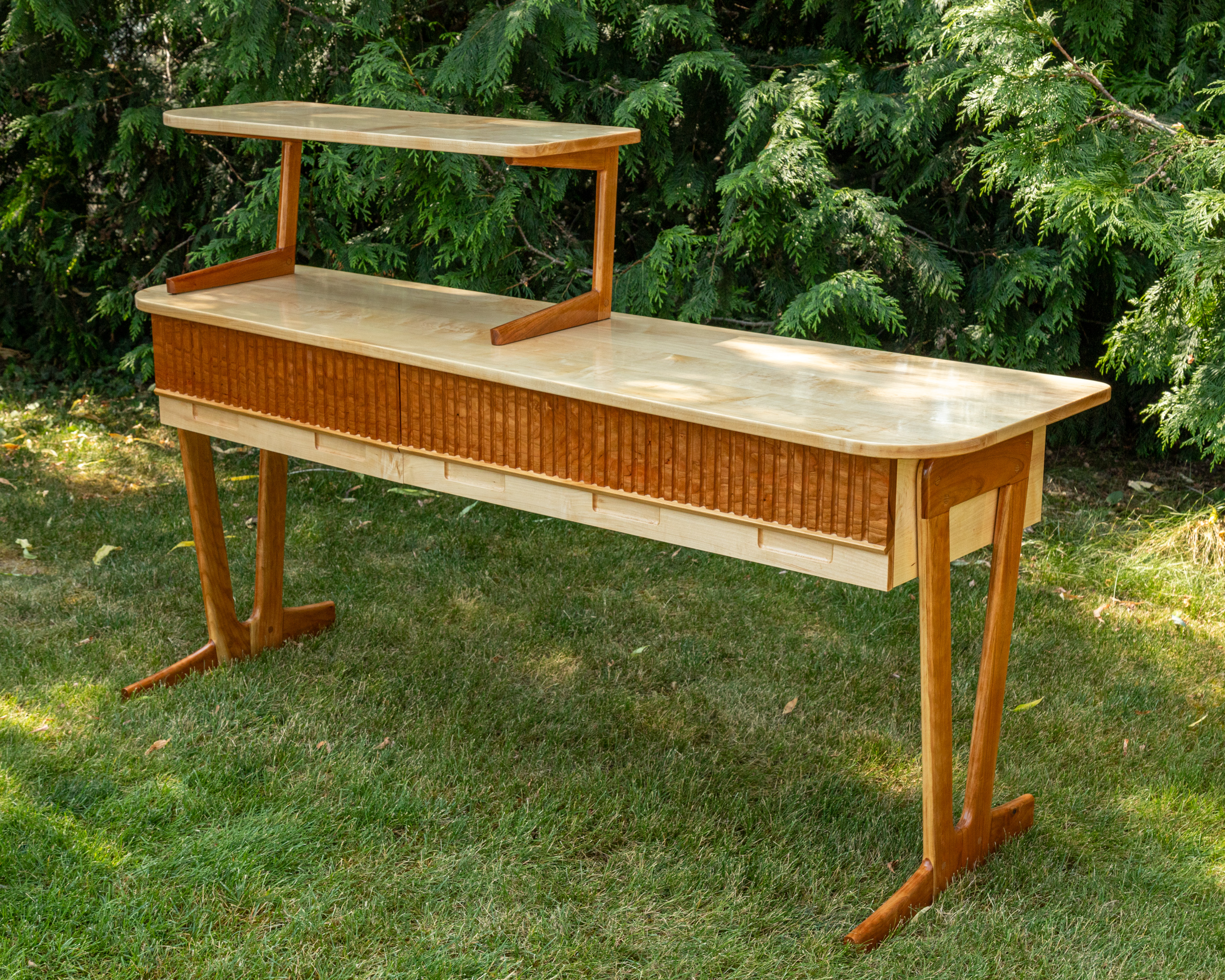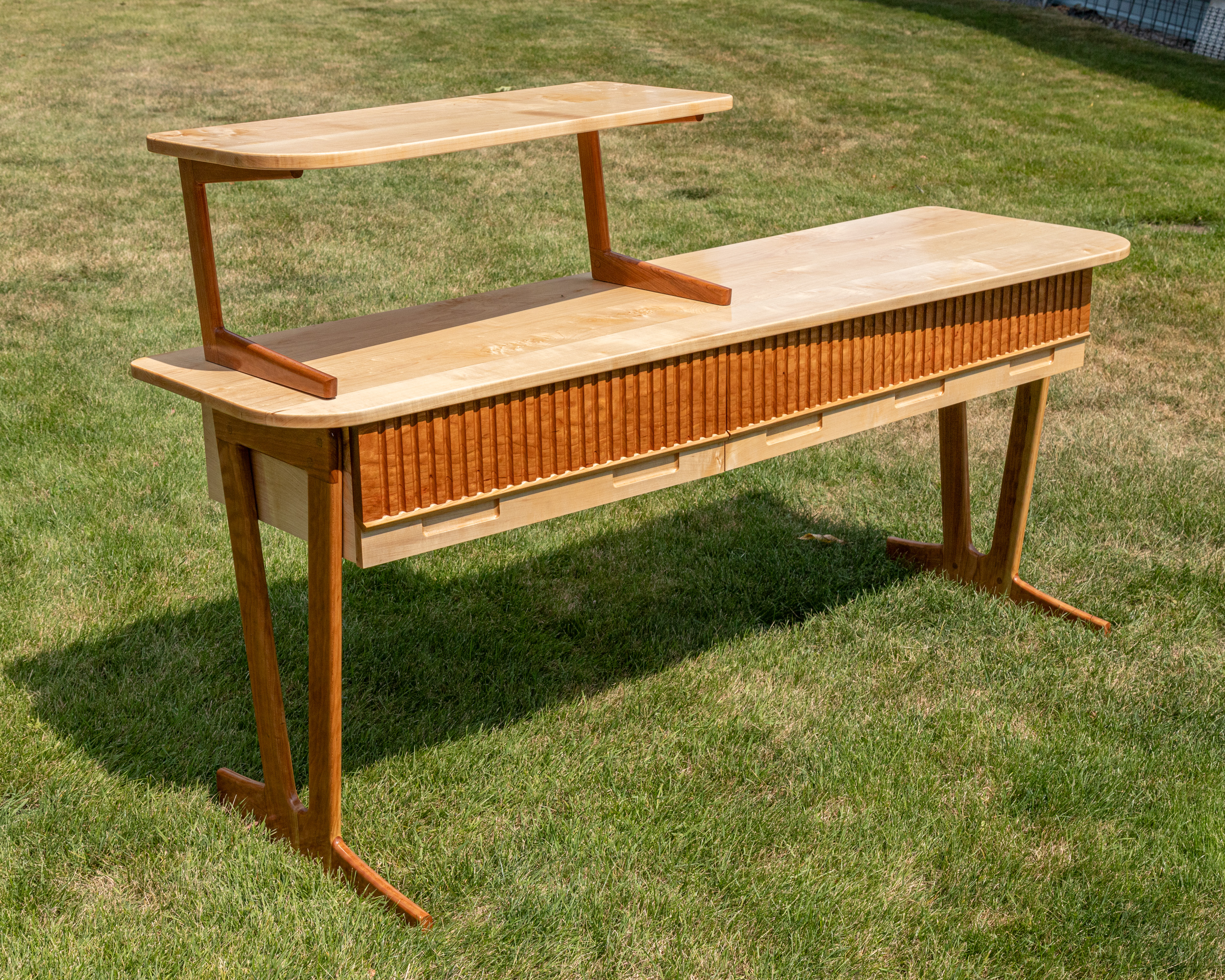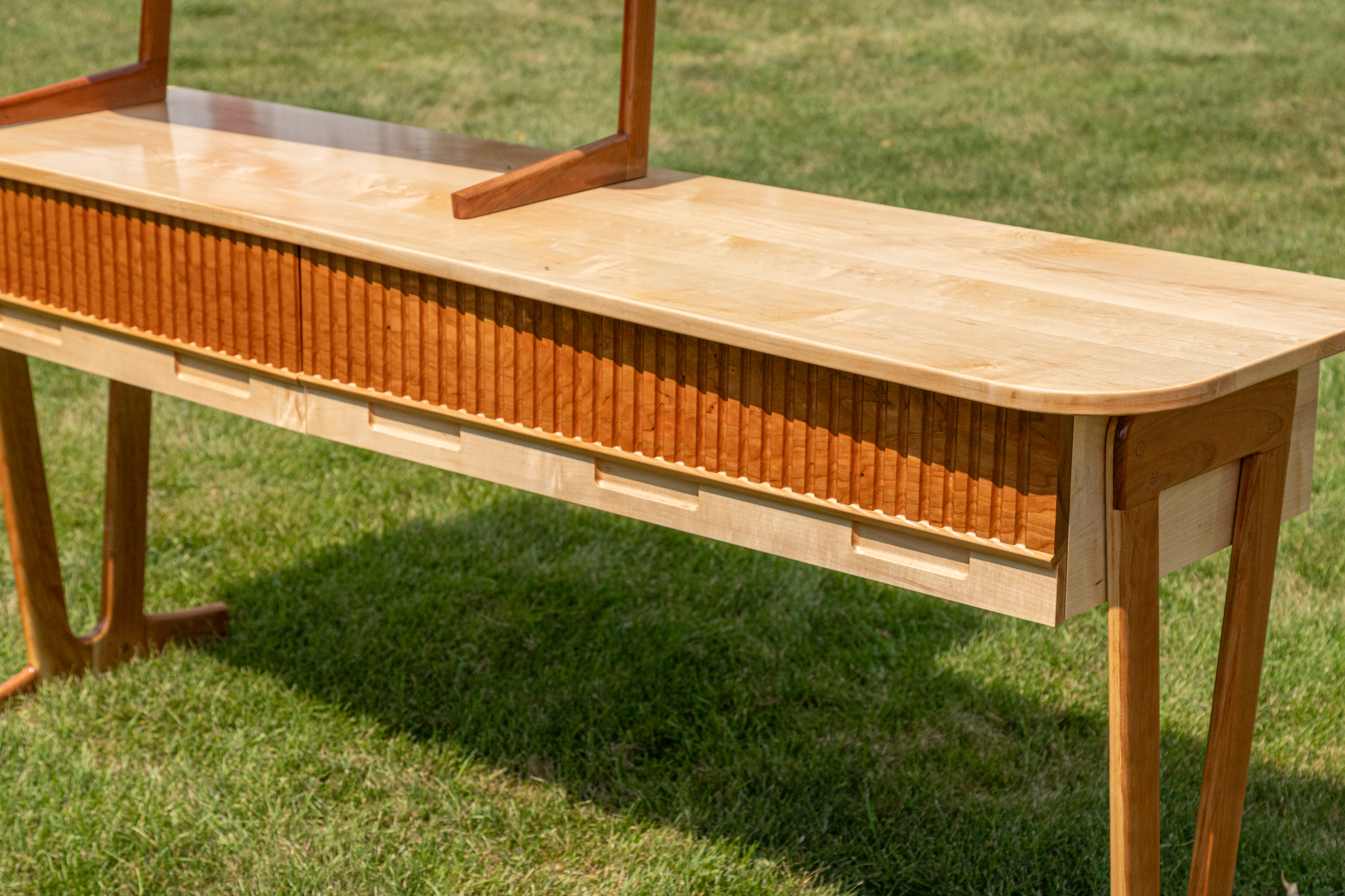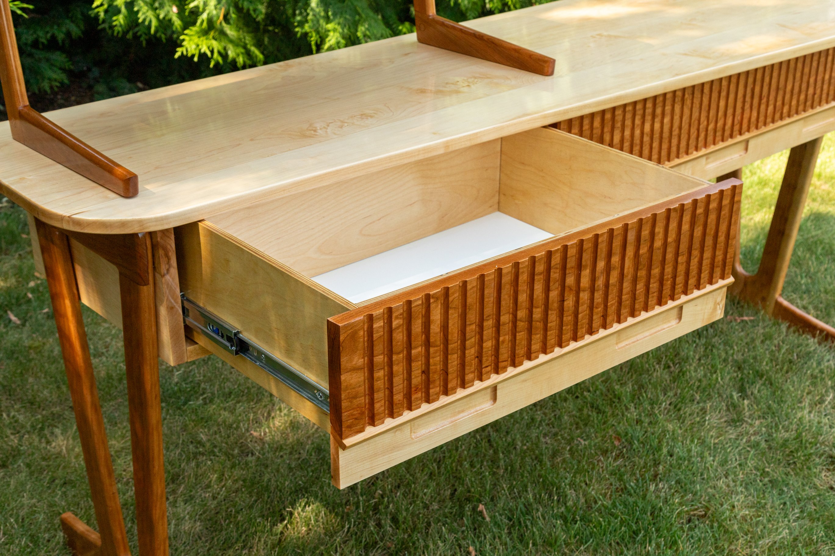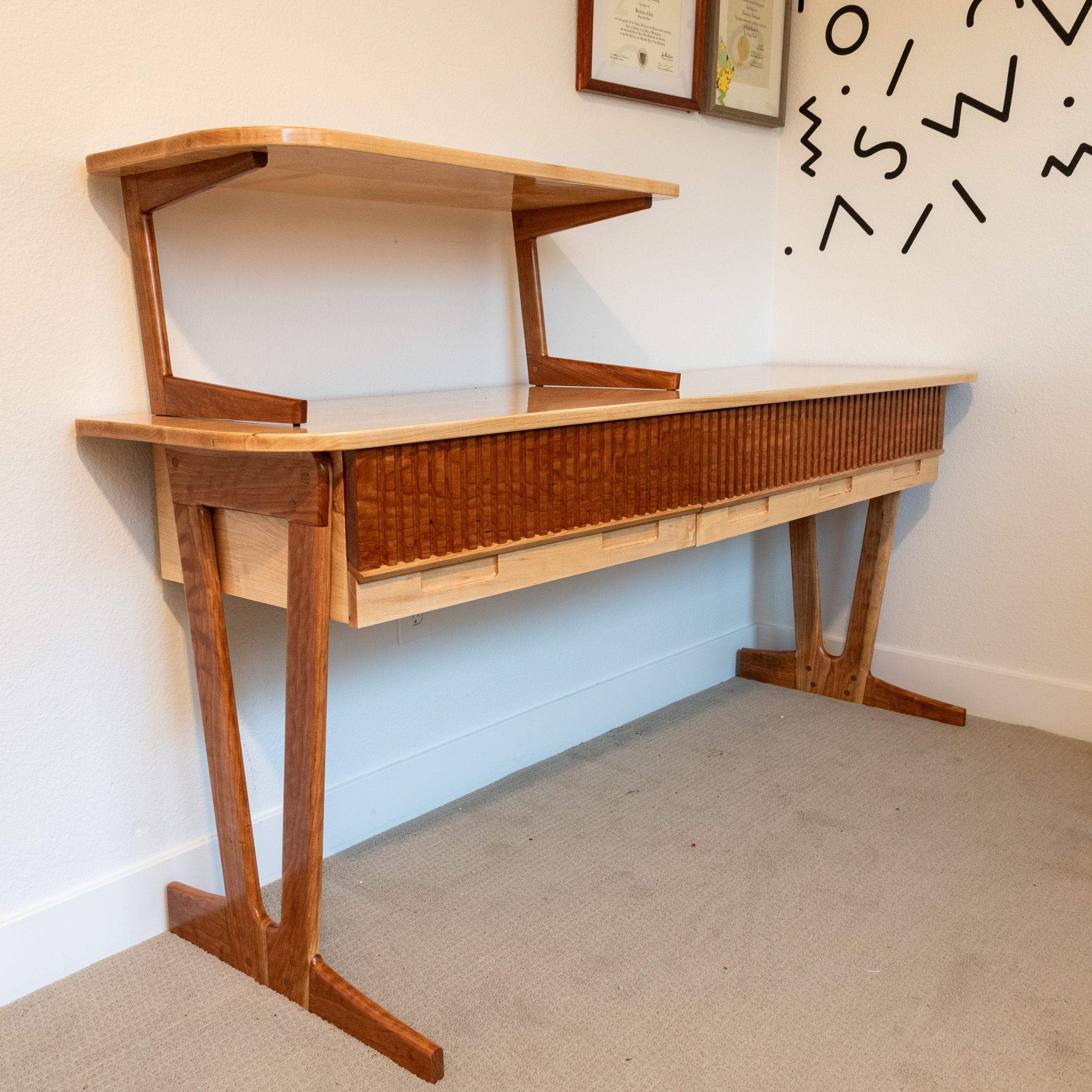 The project is predominantly cherry and maple, with the former being the primary vertical structural elements and the latter the horizontal and sheer structure. Some plywood is used in the drawer box and the sliding tray. This selection is meant to harmonize with the existing furniture pieces in cherry and Baltic birch in my residence while balancing the economic side of the project. The front panels were carefully detailed, with the division between the detachable portion and the drawer face located in the valley of the fluting. Recesses routed into the maple strip at the bottom create deeper areas for handpulls. The fluting creates more complex shadows along the face of the desk, adding intrigue. The rhythm of the fluting and the handpulls, in concert with its music-focused use, inspired the name Sequencer Desk as a reference to quantified musical patterns.