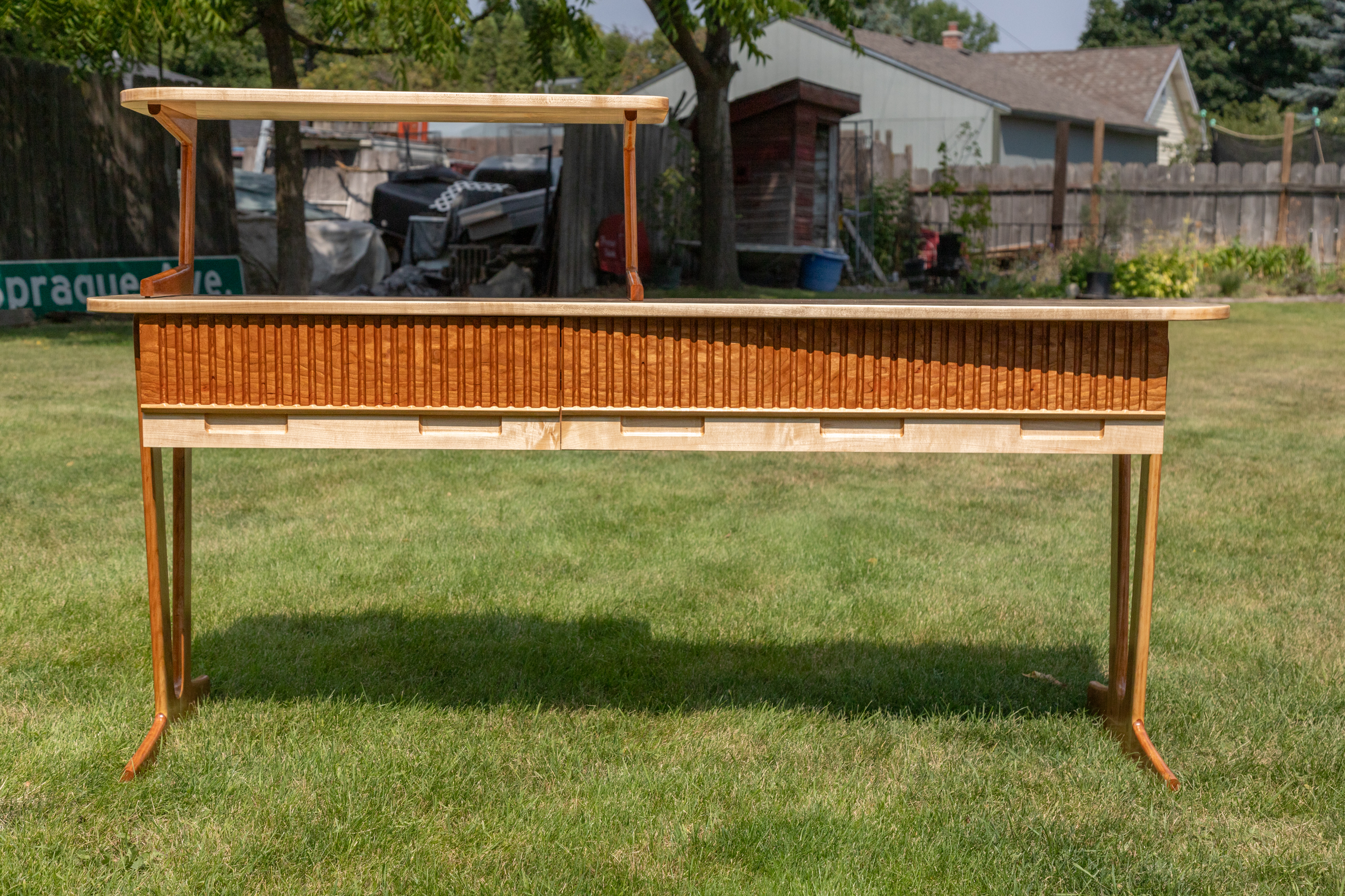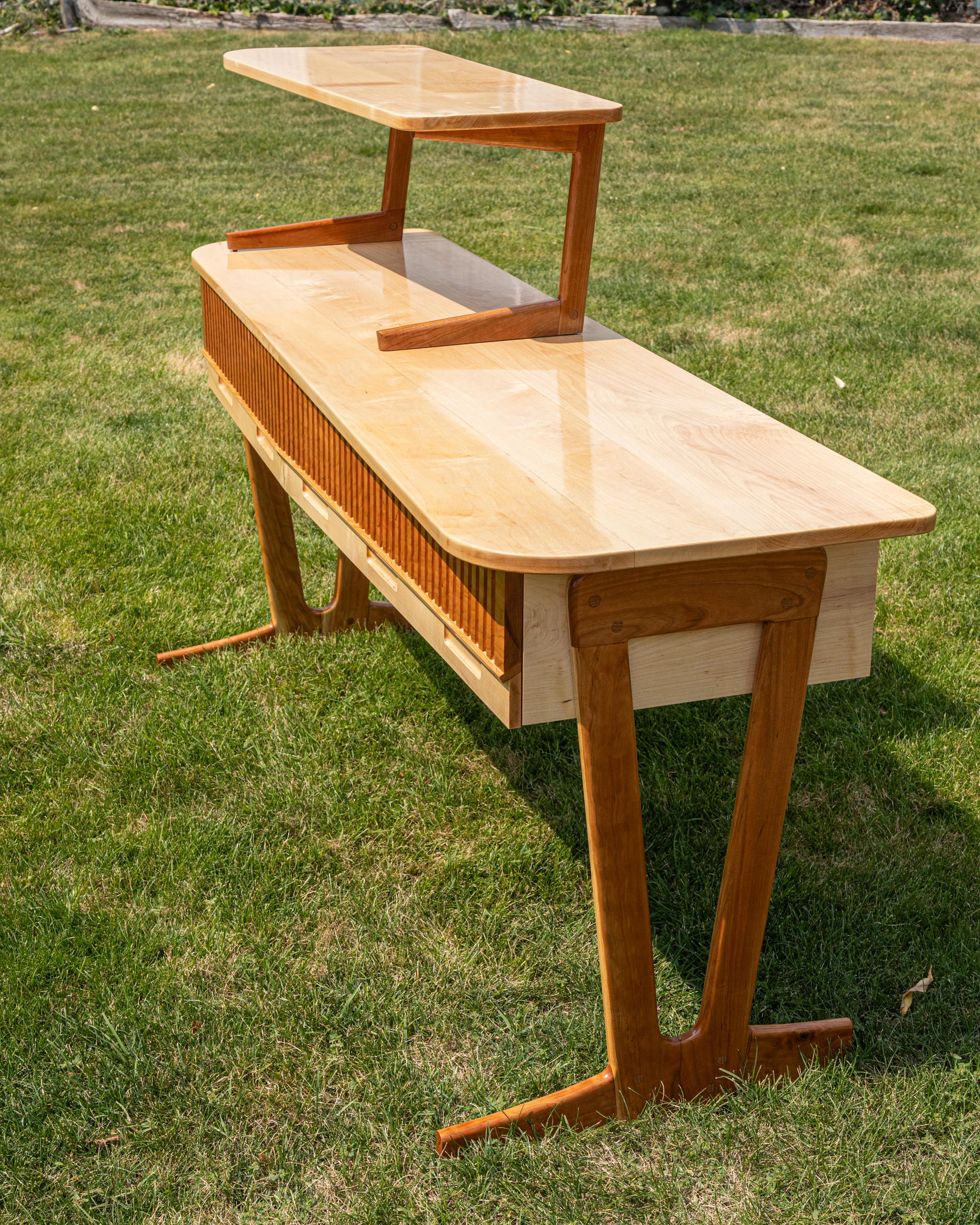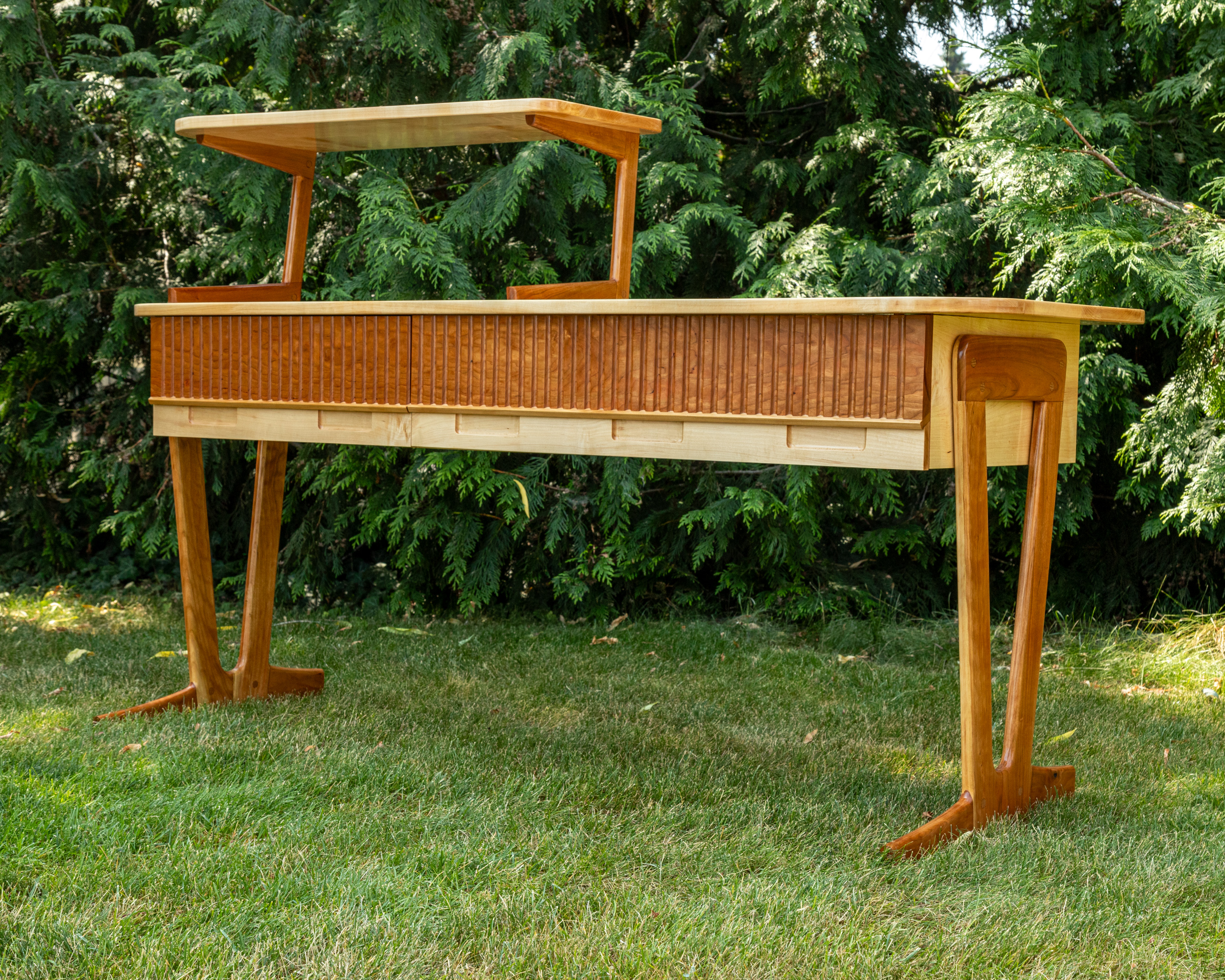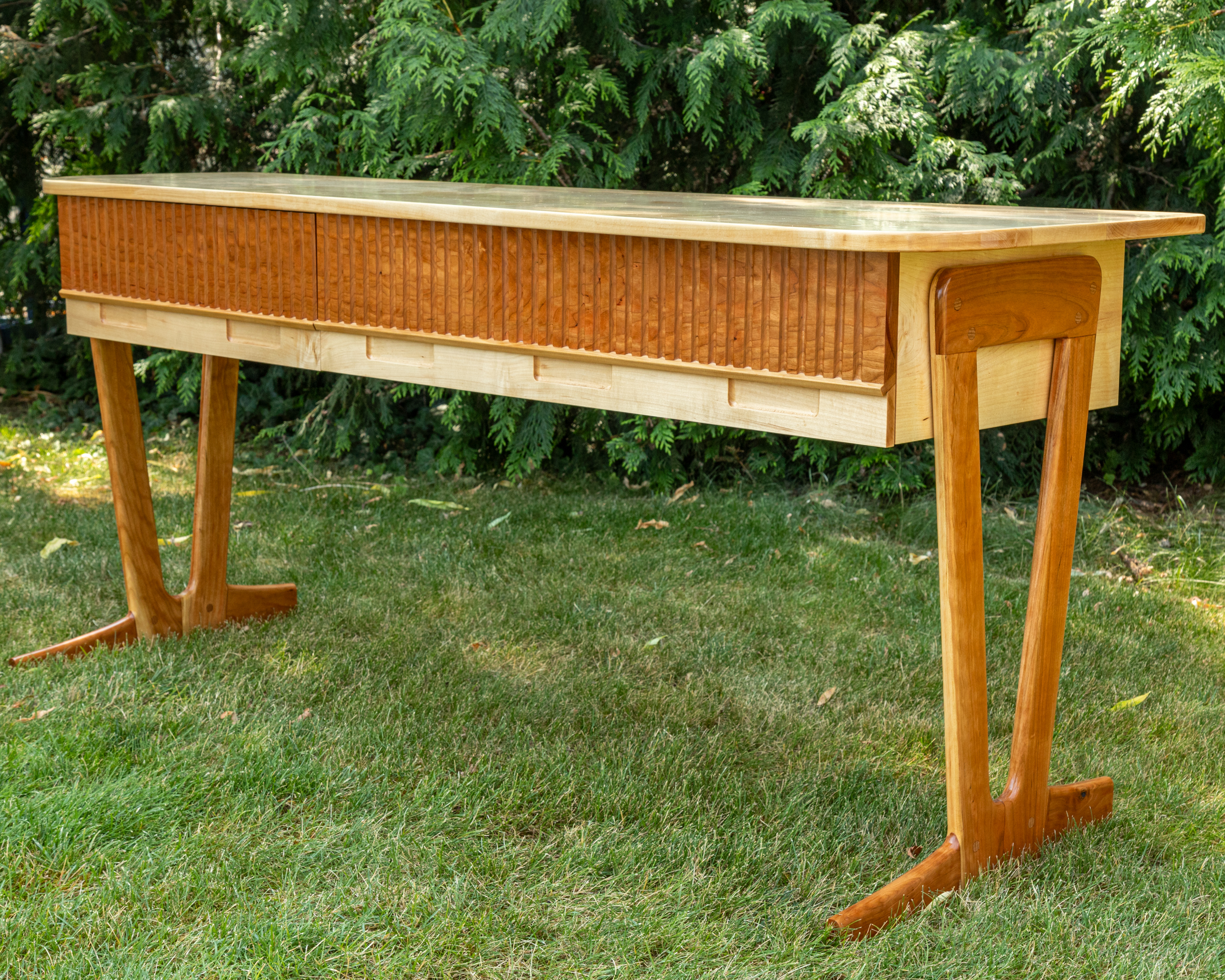 The project is predominantly cherry and maple, with the former being the primary vertical structural elements and the latter the horizontal and sheer structure. Some plywood is used in the drawer box and the sliding tray. This selection is meant to harmonize with the existing furniture pieces in cherry and Baltic birch in my residence while balancing the economic side of the project. The front panels were carefully detailed, with the division between the detachable portion and the drawer face located in the valley of the fluting. Recesses routed into the maple strip at the bottom create deeper areas for handpulls. The fluting creates more complex shadows along the face of the desk, adding intrigue. The rhythm of the fluting and the handpulls, in concert with its music-focused use, inspired the name Sequencer Desk as a reference to quantified musical patterns.
