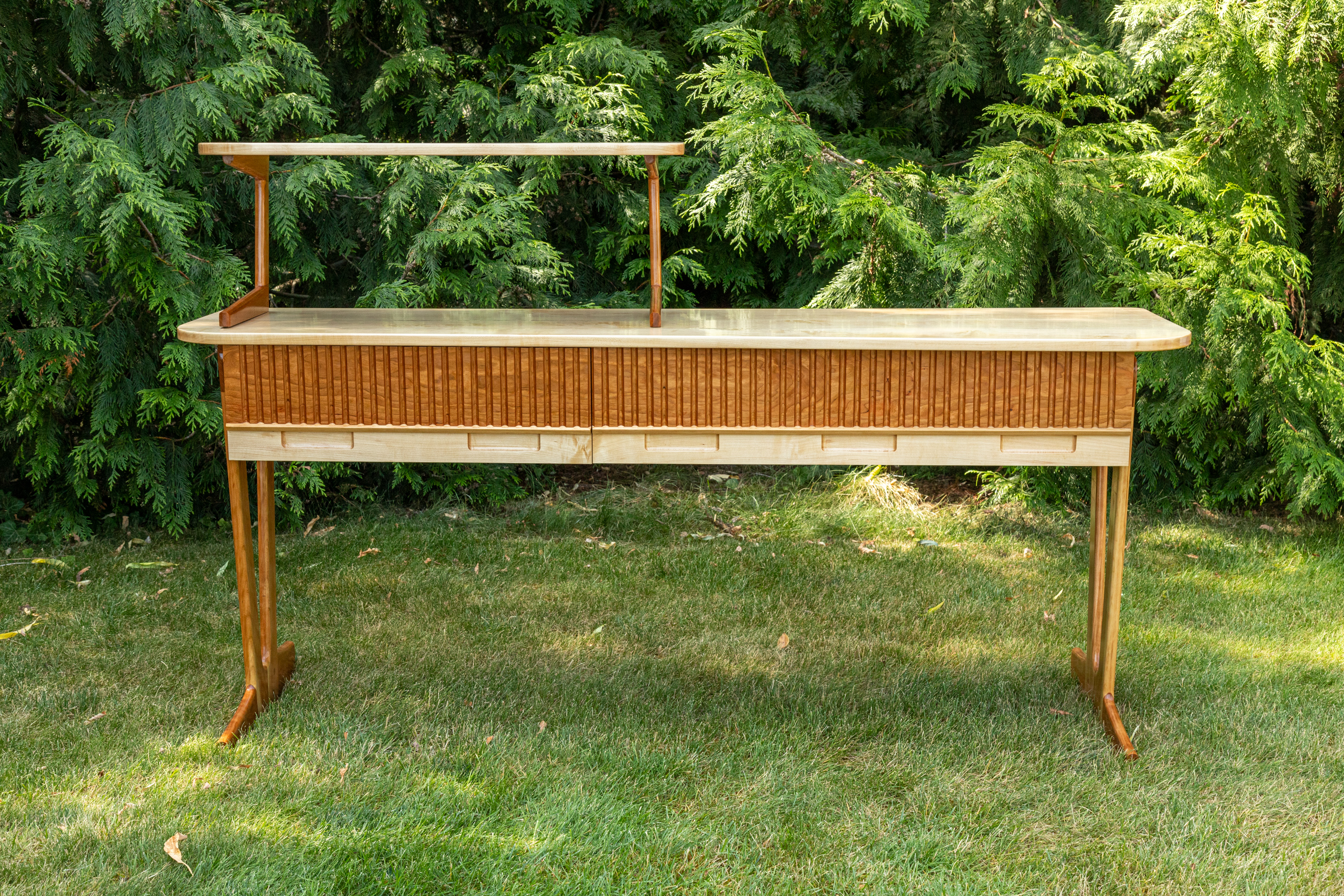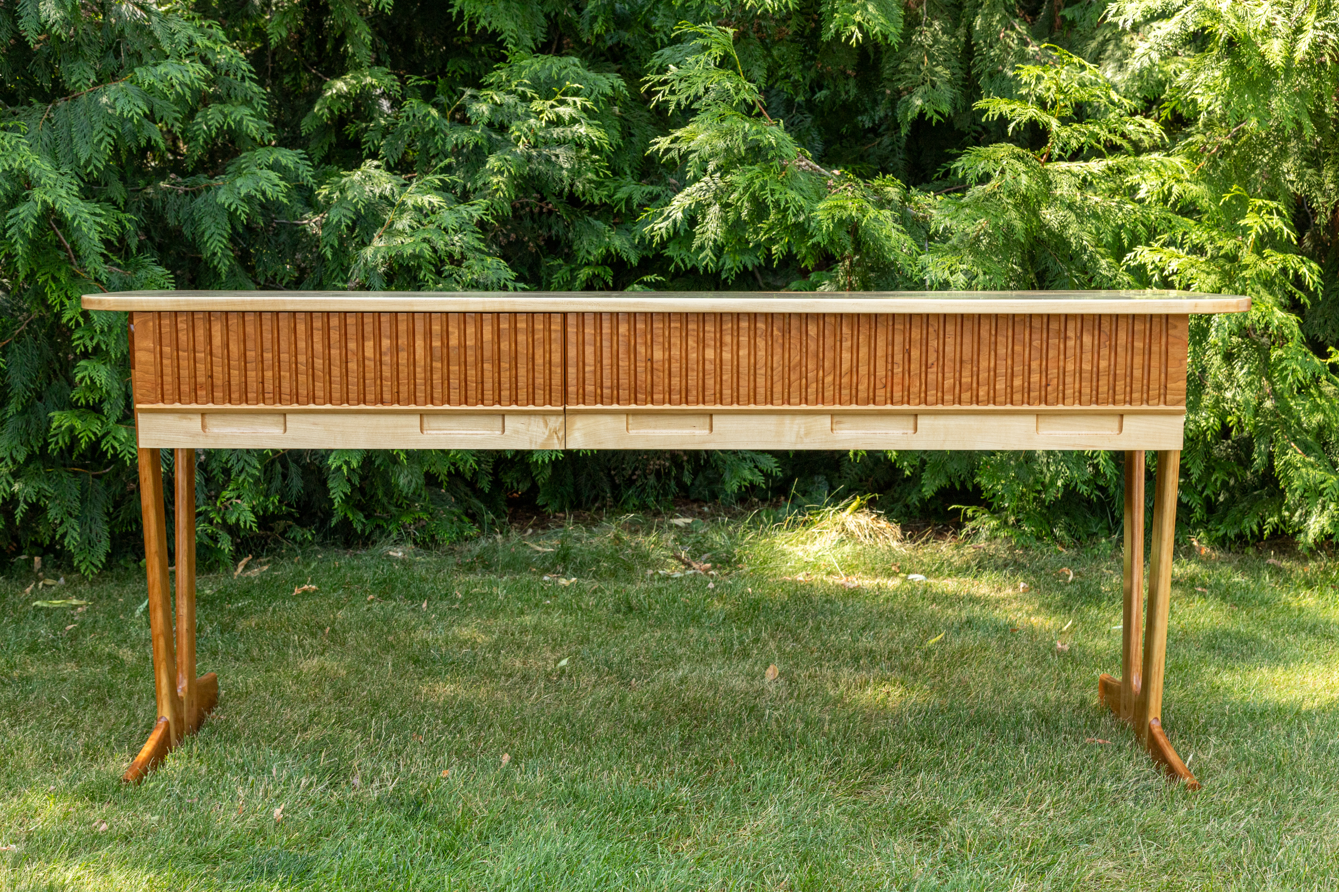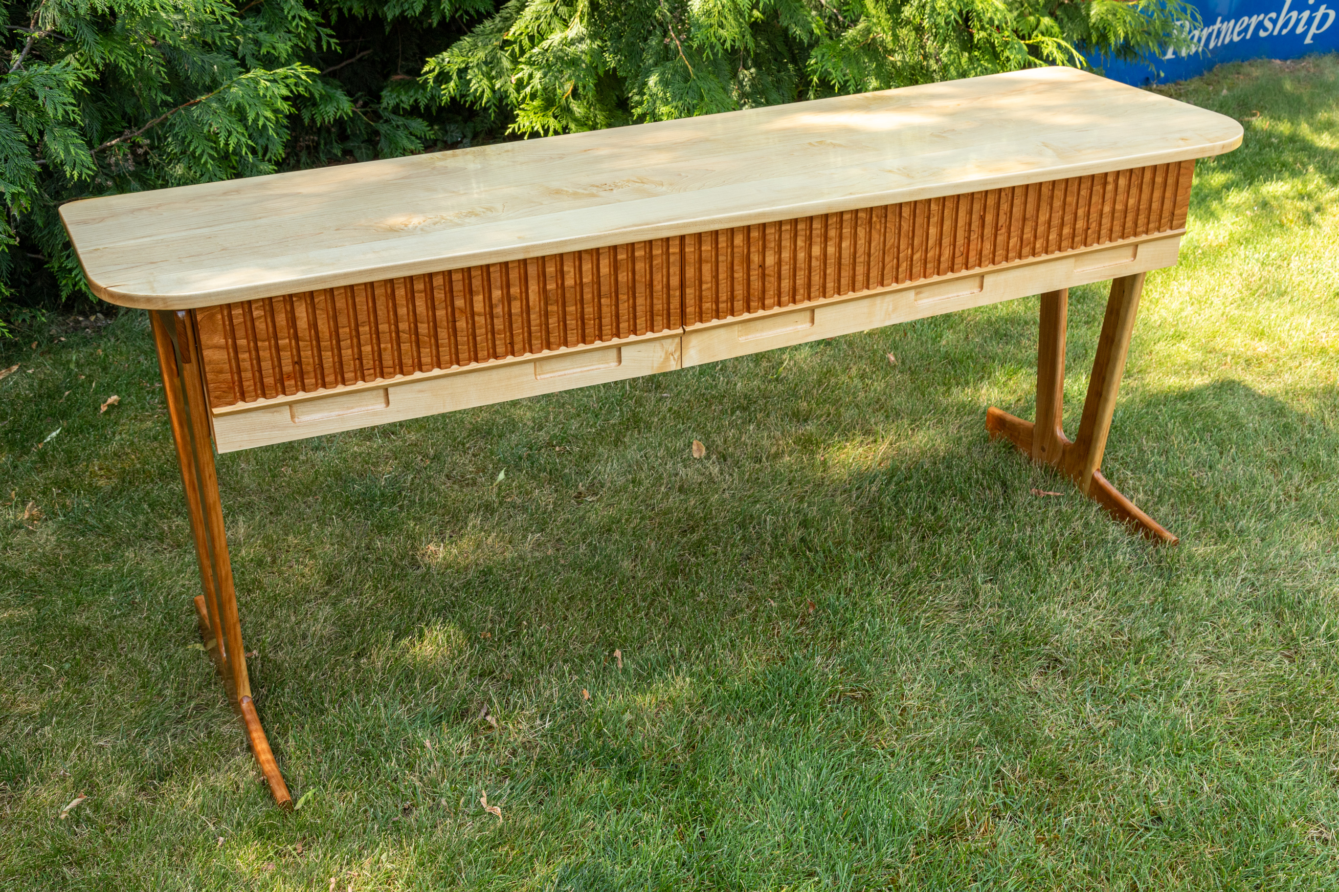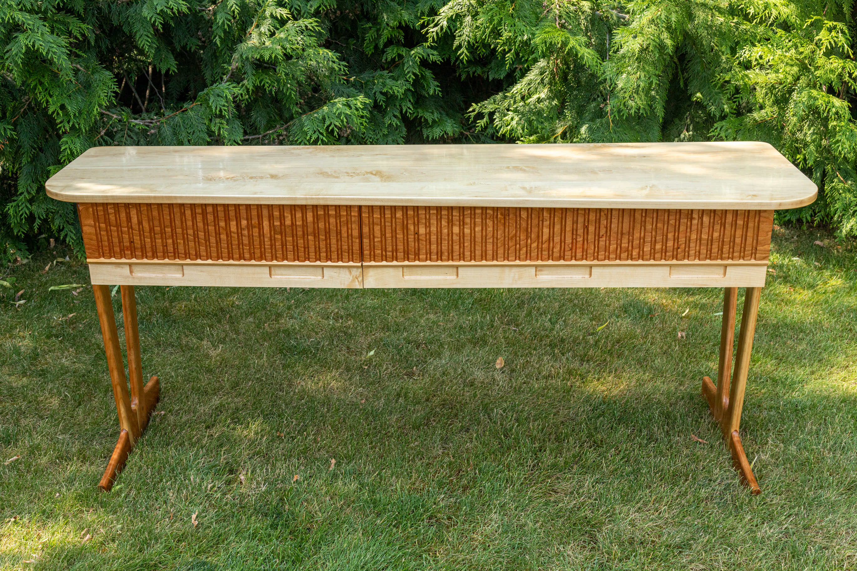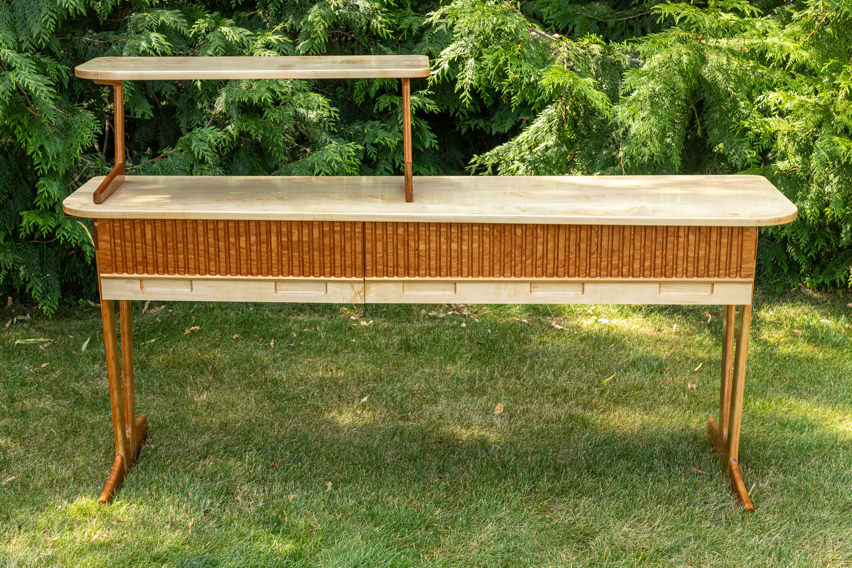 The project is predominantly cherry and maple, with the former being the primary vertical structural elements and the latter the horizontal and sheer structure. Some plywood is used in the drawer box and the sliding tray. This selection is meant to harmonize with the existing furniture pieces in cherry and Baltic birch in my residence while balancing the economic side of the project. The front panels were carefully detailed, with the division between the detachable portion and the drawer face located in the valley of the fluting. Recesses routed into the maple strip at the bottom create deeper areas for handpulls. The fluting creates more complex shadows along the face of the desk, adding intrigue. The rhythm of the fluting and the handpulls, in concert with its music-focused use, inspired the name Sequencer Desk as a reference to quantified musical patterns.
