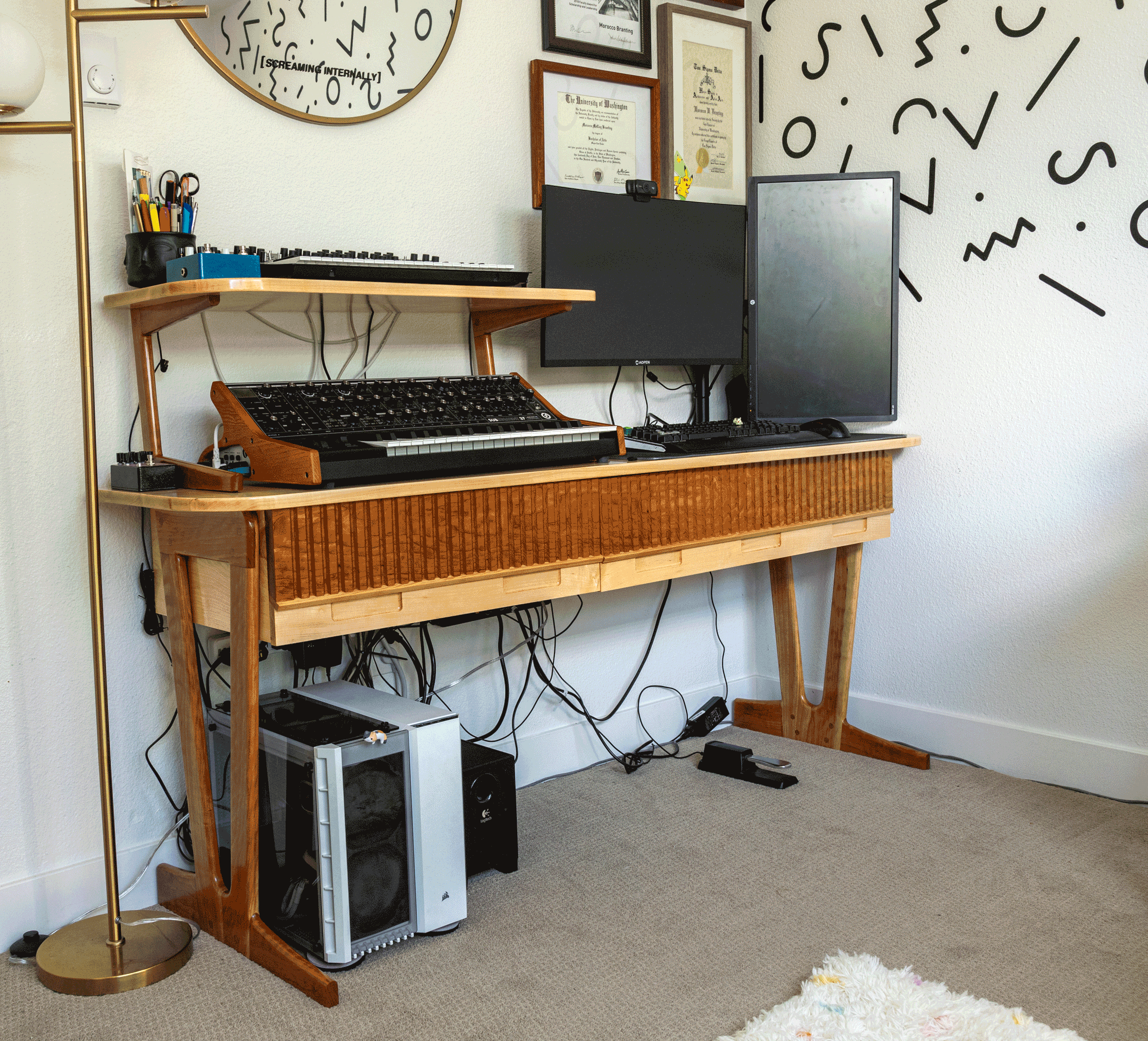 For the past five or so years, I have used a simple L shaped desk given to me by a friend. It has served me well, but in using it for five years with a variety of different hobbies, I came to understand its limitations very well. As a graduation gift to myself, I created the Sequencer Desk. I spent months progressing through the design work as a side exploration to my schoolwork, which enabled thoughtful consideration of the activities occurring at the workplace and also of the objects on or adjacent the desk. The desk has two primary functions: to facilitate musical exploration and creation, and to act as an interface for my desktop computer, at which I do digital art, play games, and manage this website (among other things).