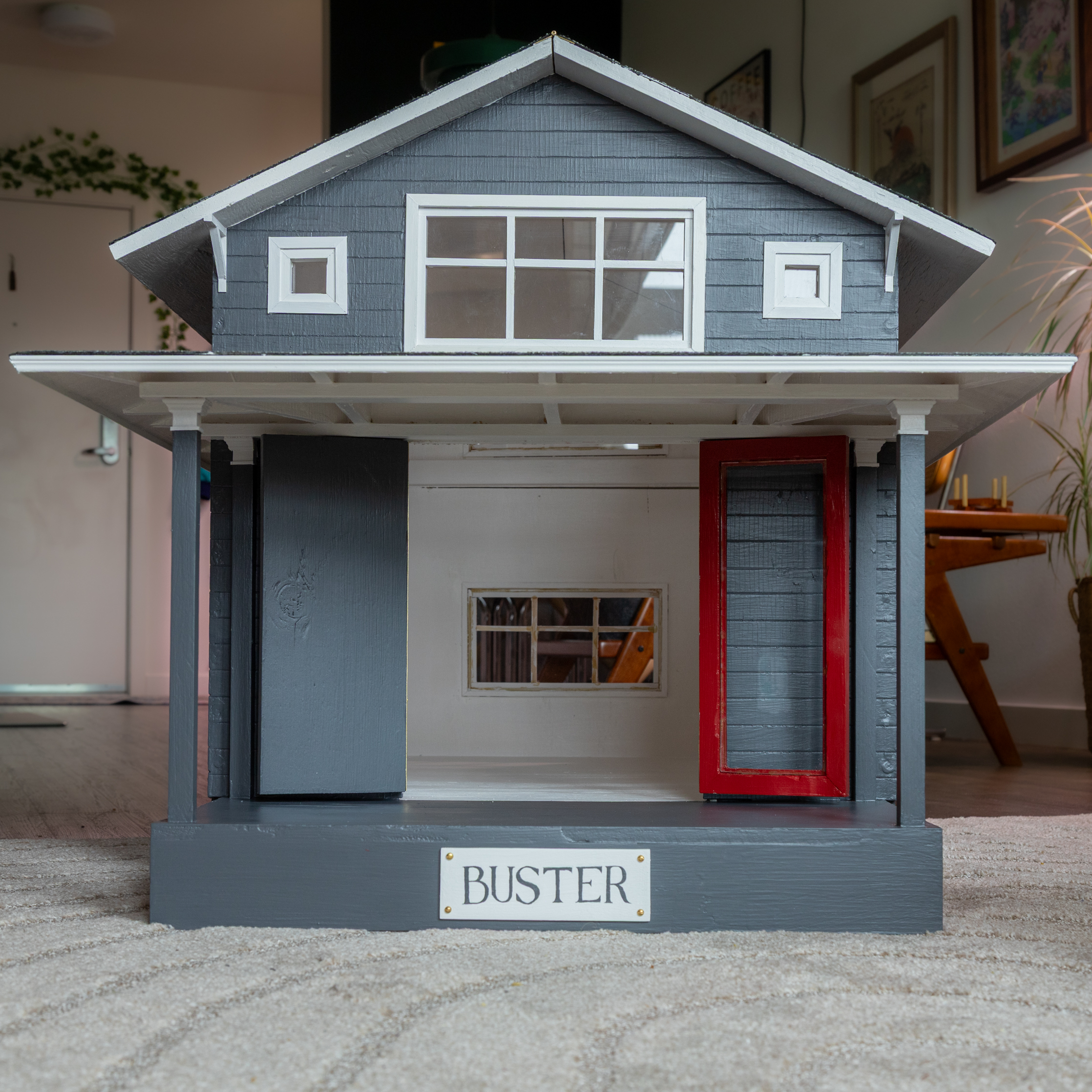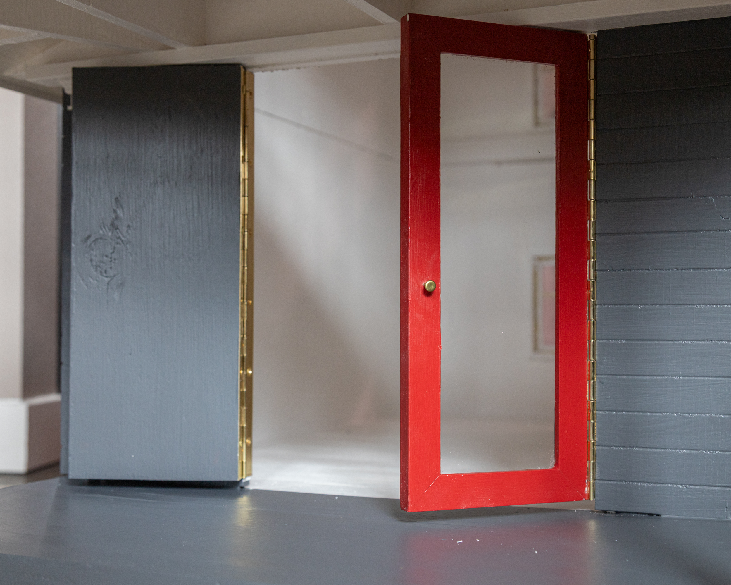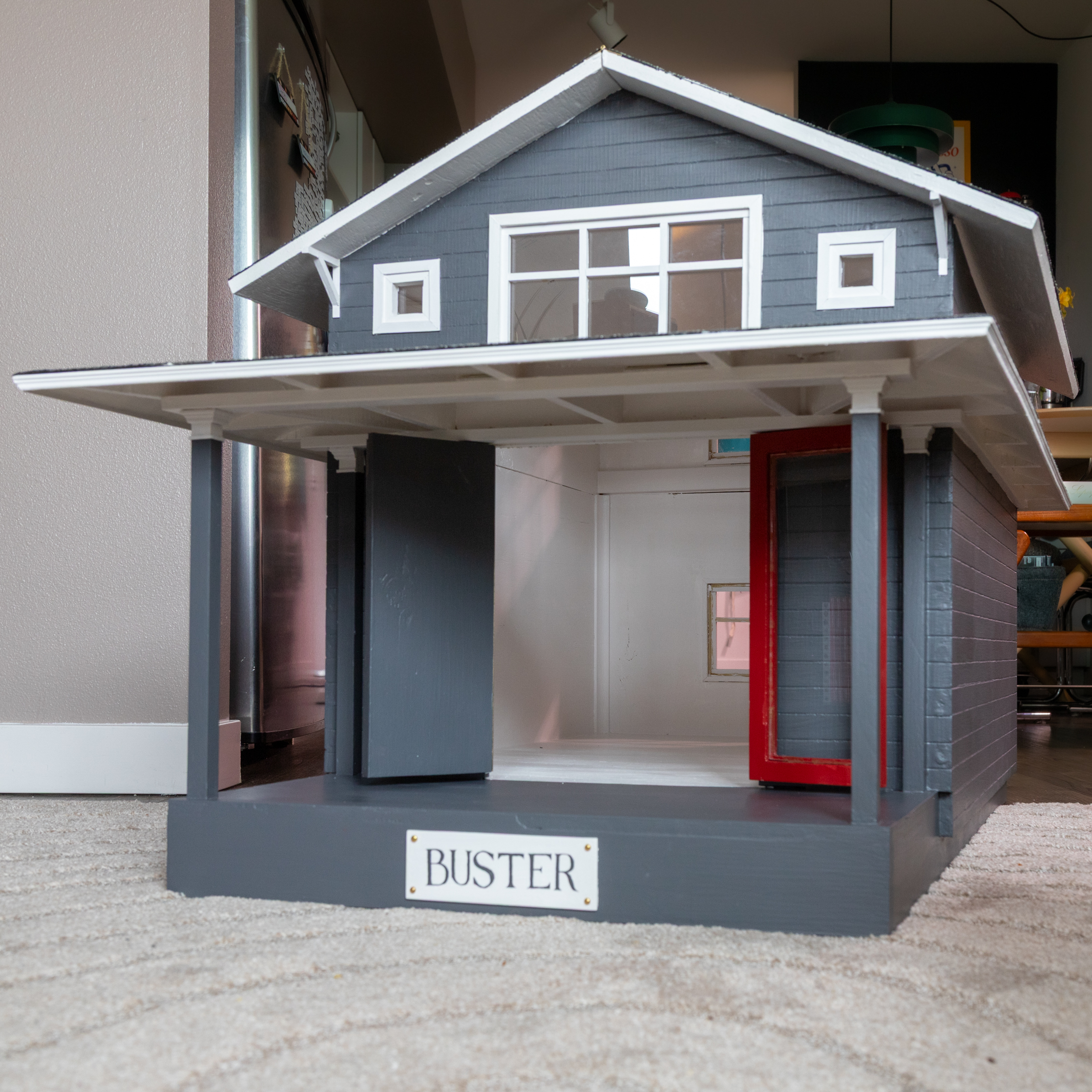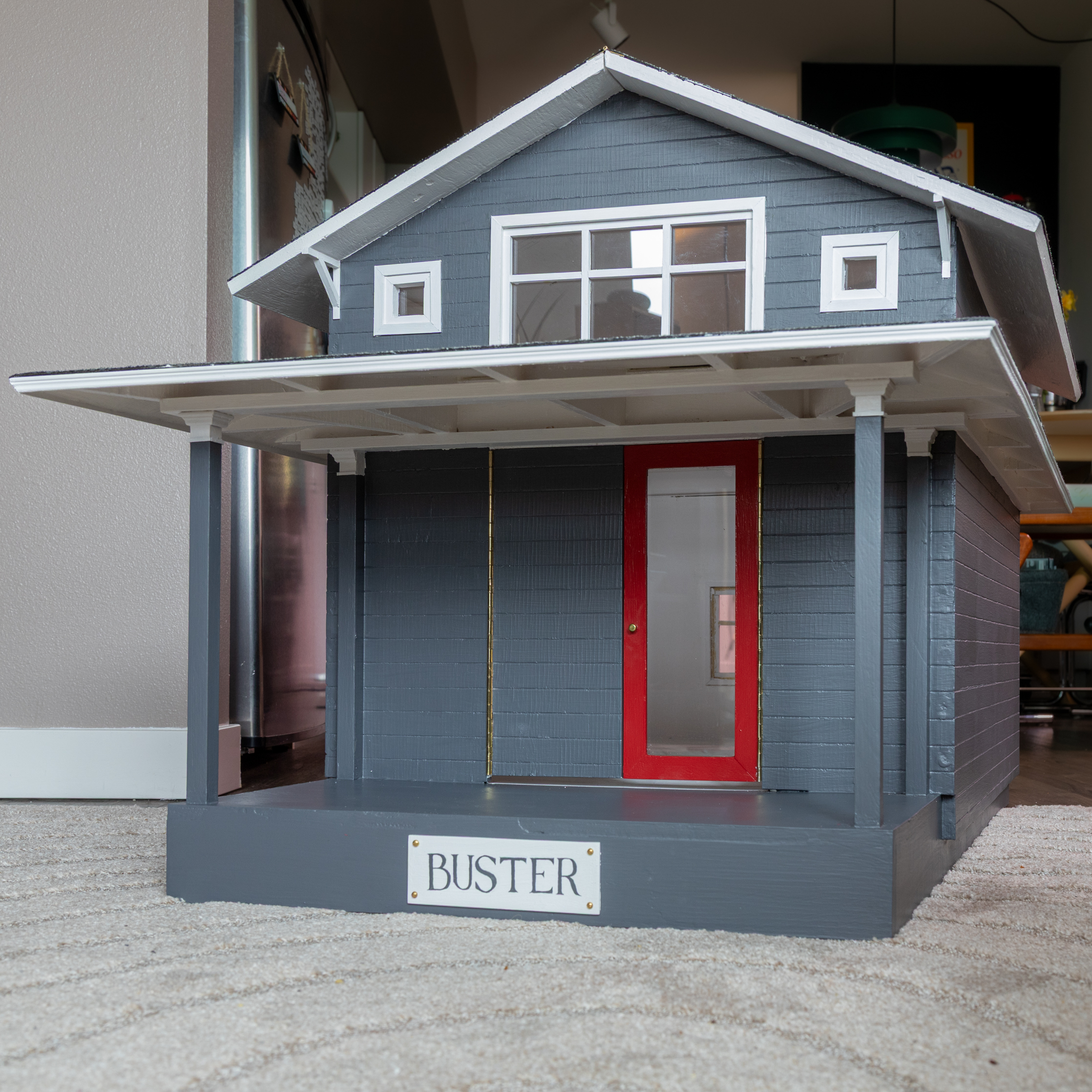 The French doors were carefully designed to resemble the existing home when closed, but open to accommodate the dog. They fit snugly with a friction fit so that no hardware beyond the tiny doorknob is required to secure them or open them. The roof also features a continuous piano hinge so that the interior is easy to decorate and clean.